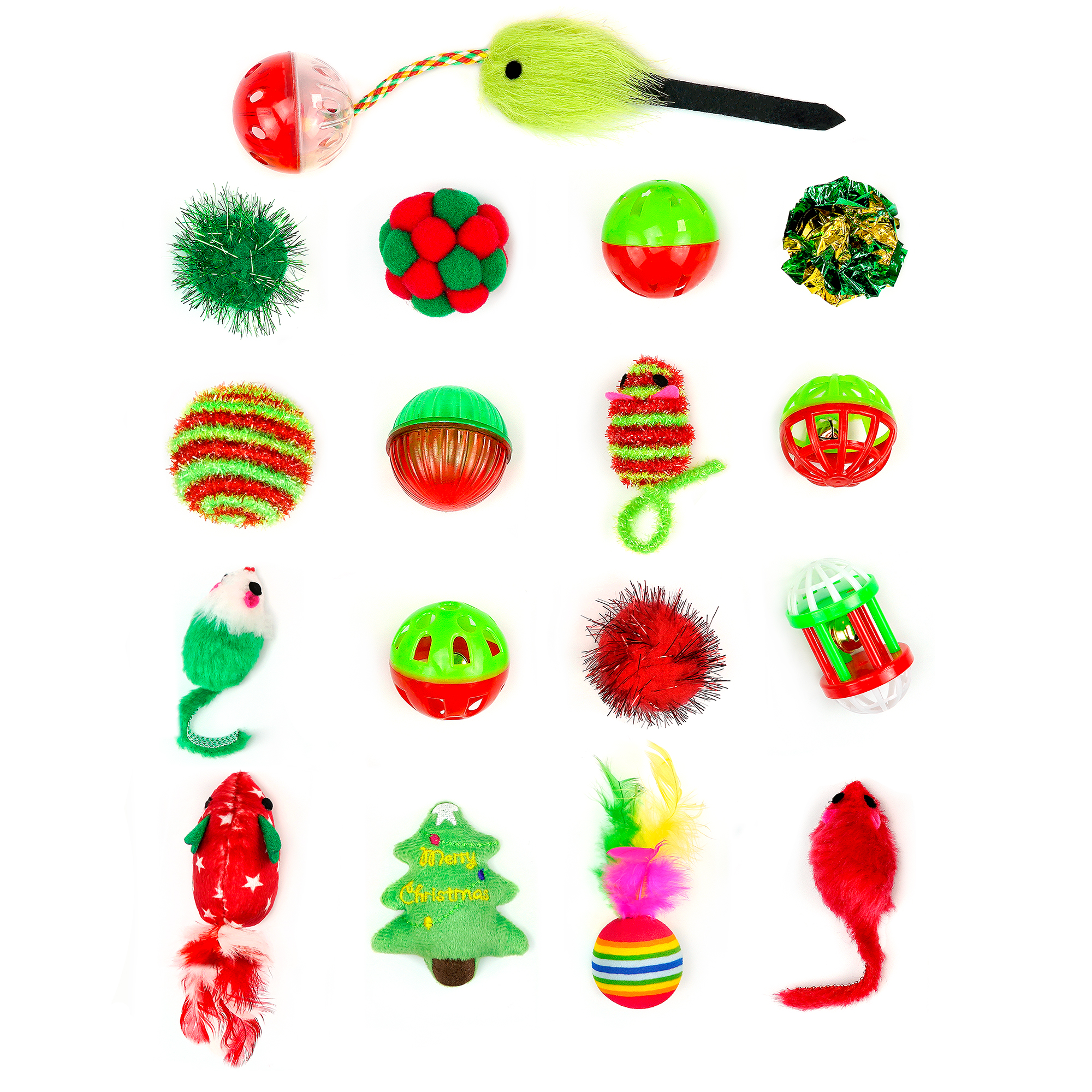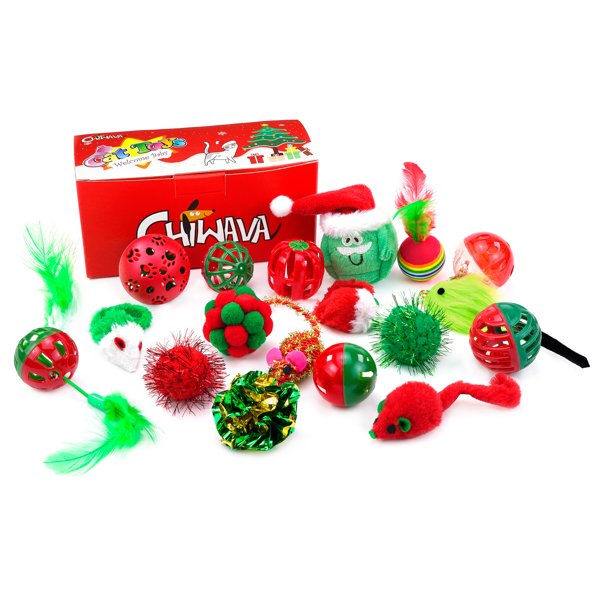 Chiwava Christmas cat toy set of 17 different toys. There are mice, feather, plush toys, bell, rattle ball and crinkle balls in Christmas bag and Christmas box suitable for gifts.Contains variety sounds, materials and features that cats like.specially made for activity, interactive and Christmas toy. stimulate your cat’s natural playful instincts, provide them hours of fun and exercise.perfect for your furry friend’s presents at Christmas.